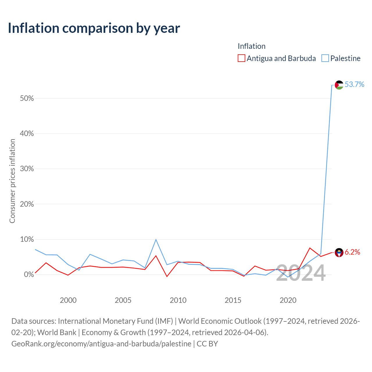 Over the past 28 years, Antigua and Barbuda has recorded an average annual inflation rate of 2.23%, compared with 4.9% in Palestine. In 2024, inflation was 6.2% in Antigua and Barbuda and 53.7% in Palestine.