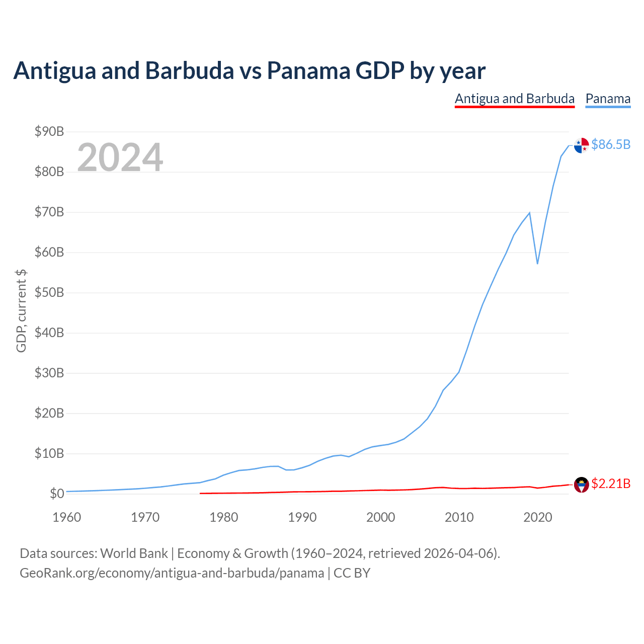 Antigua and Barbuda has a GDP of $2.21B compared to $86.5B for Panama, ranking 177/197 and 78/197 by economy size, respectively.