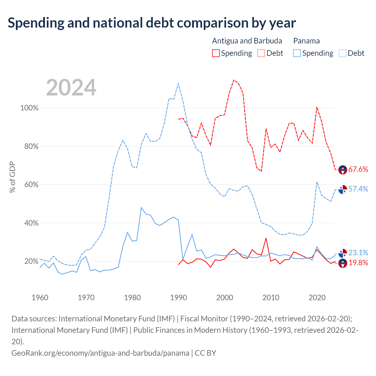 Antigua and Barbuda has $1.49B in government debt (67.6% of GDP), compared to $49.6B (57.4% of GDP) in Panama.