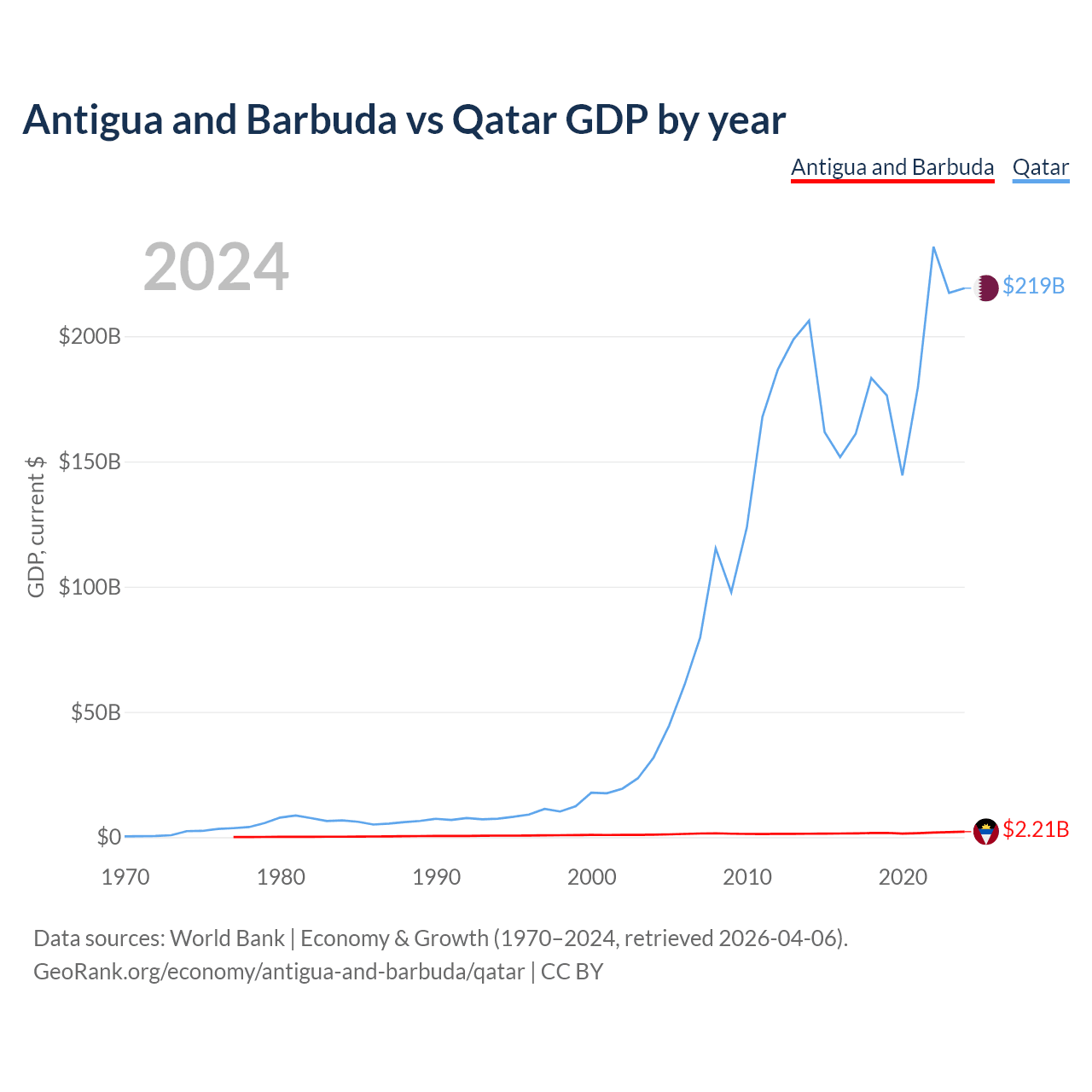 Antigua and Barbuda has a GDP of $2.21B compared to $219B for Qatar, ranking 177/197 and 56/197 by economy size, respectively.