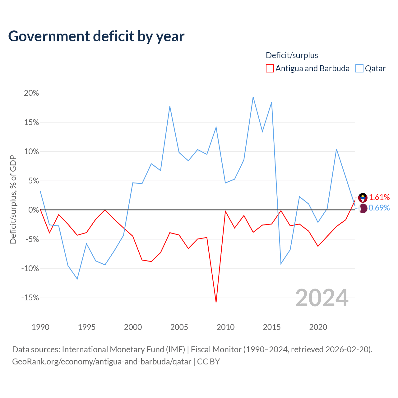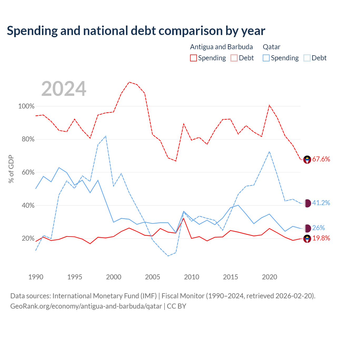 Antigua and Barbuda has $1.49B in government debt (67.6% of GDP), compared to $90.2B (41.2% of GDP) in Qatar.