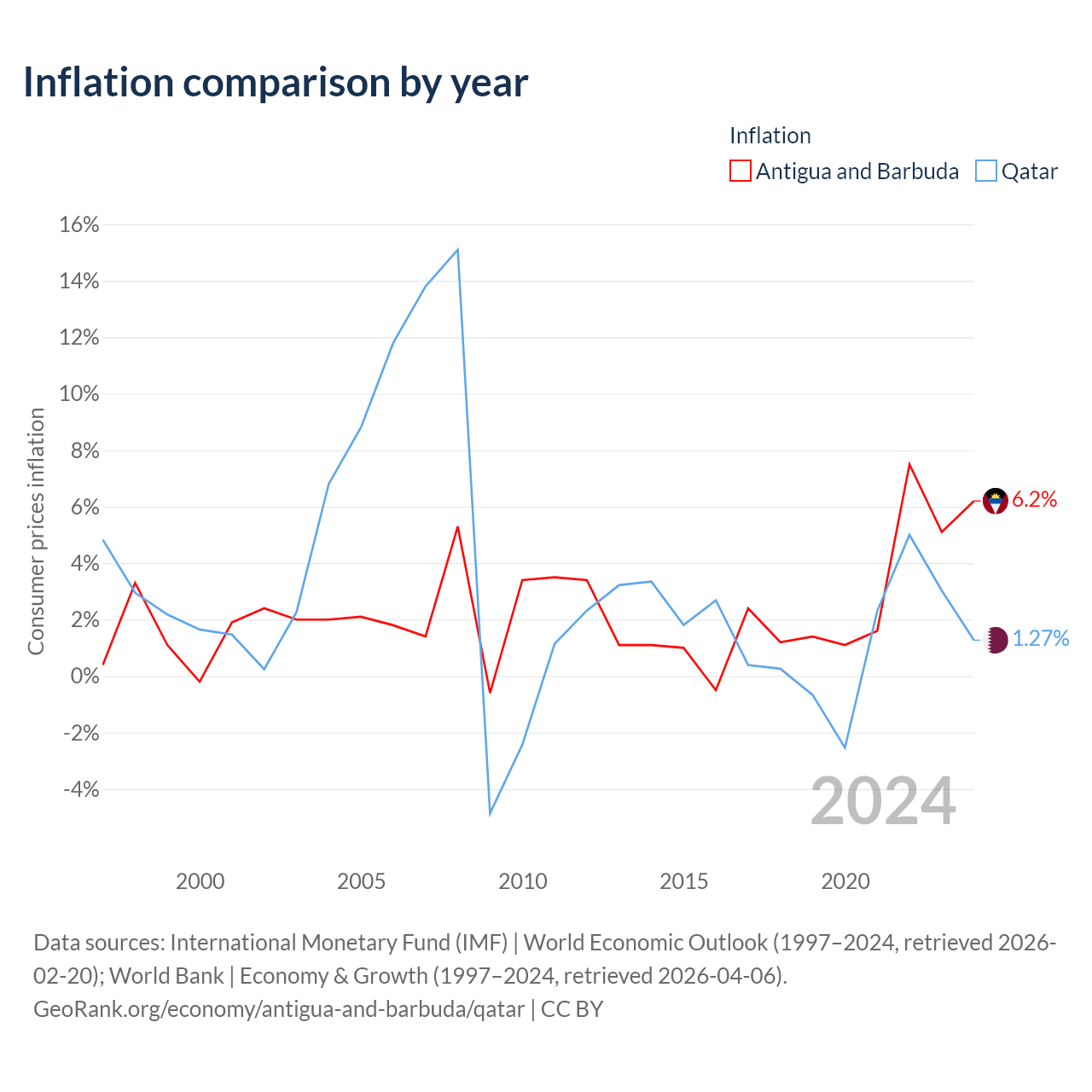 Over the past 28 years, Antigua and Barbuda has recorded an average annual inflation rate of 2.23%, compared with 3.15% in Qatar. In 2024, inflation was 6.2% in Antigua and Barbuda and 1.27% in Qatar.