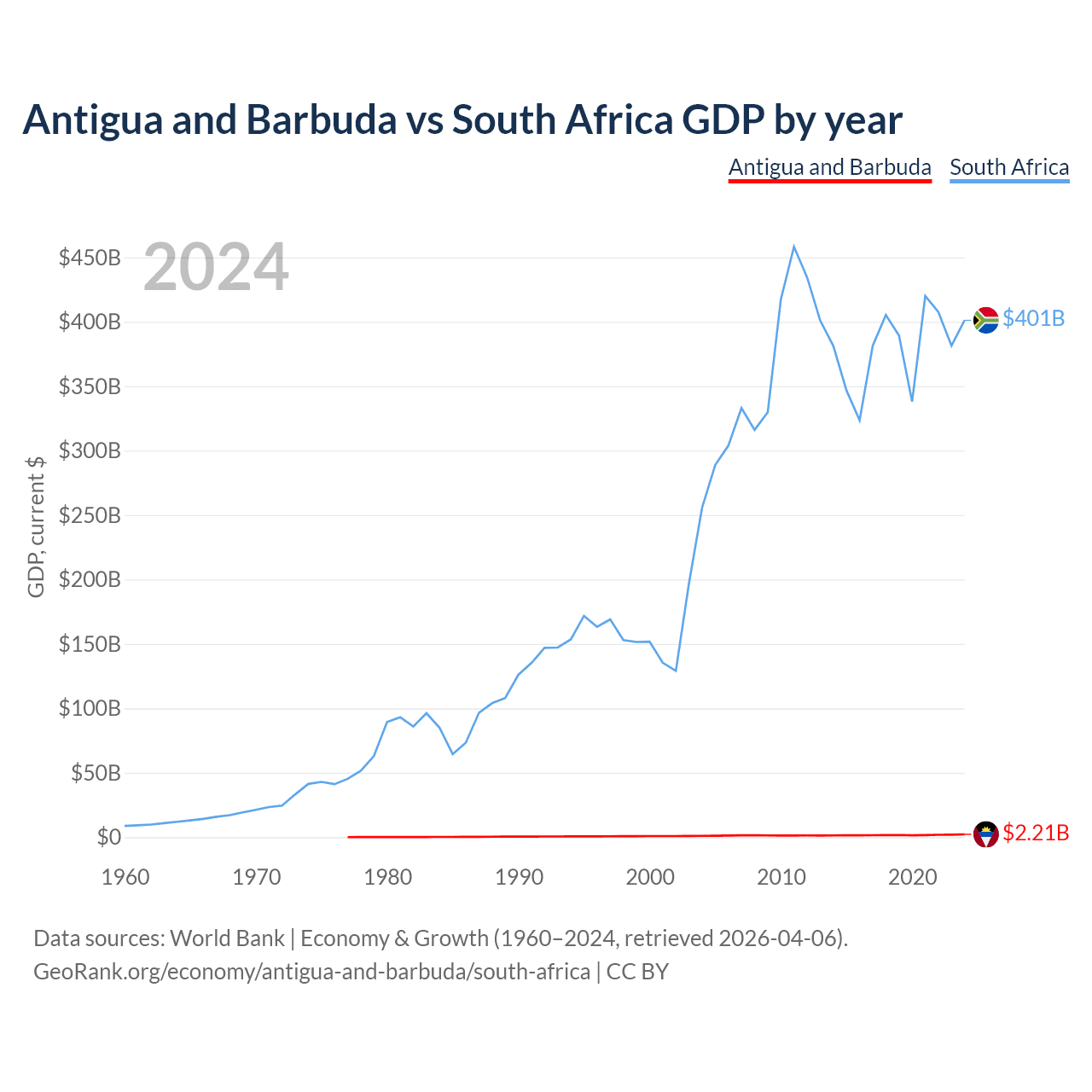 Antigua and Barbuda has a GDP of $2.21B compared to $401B for South Africa, ranking 177/197 and 40/197 by economy size, respectively.