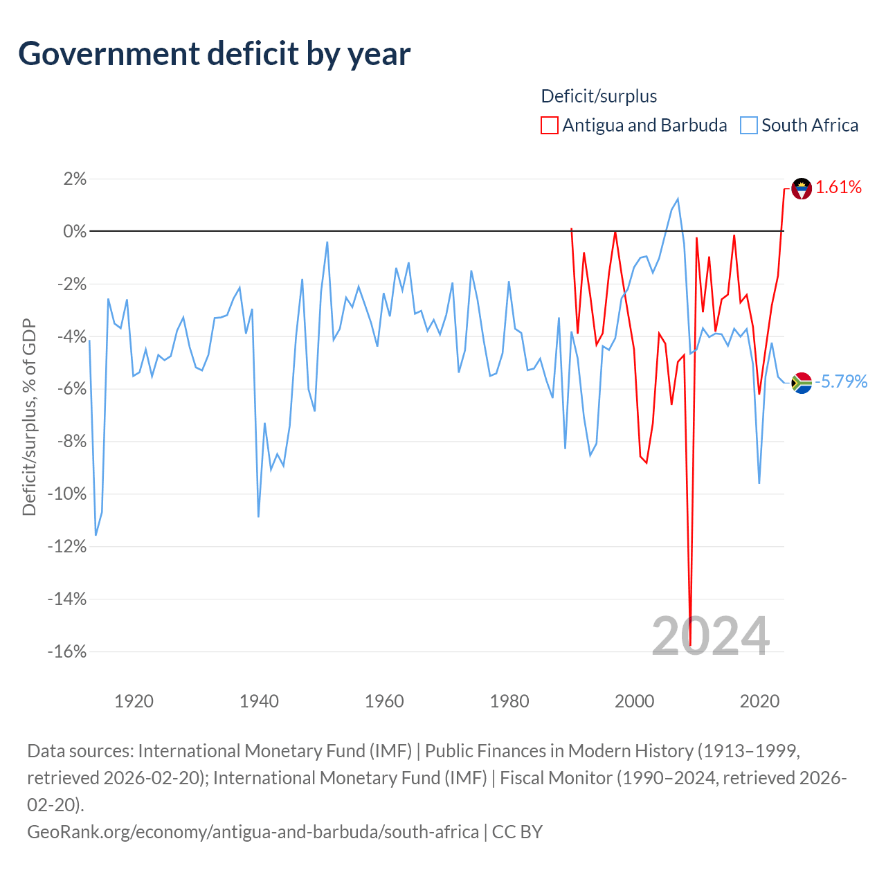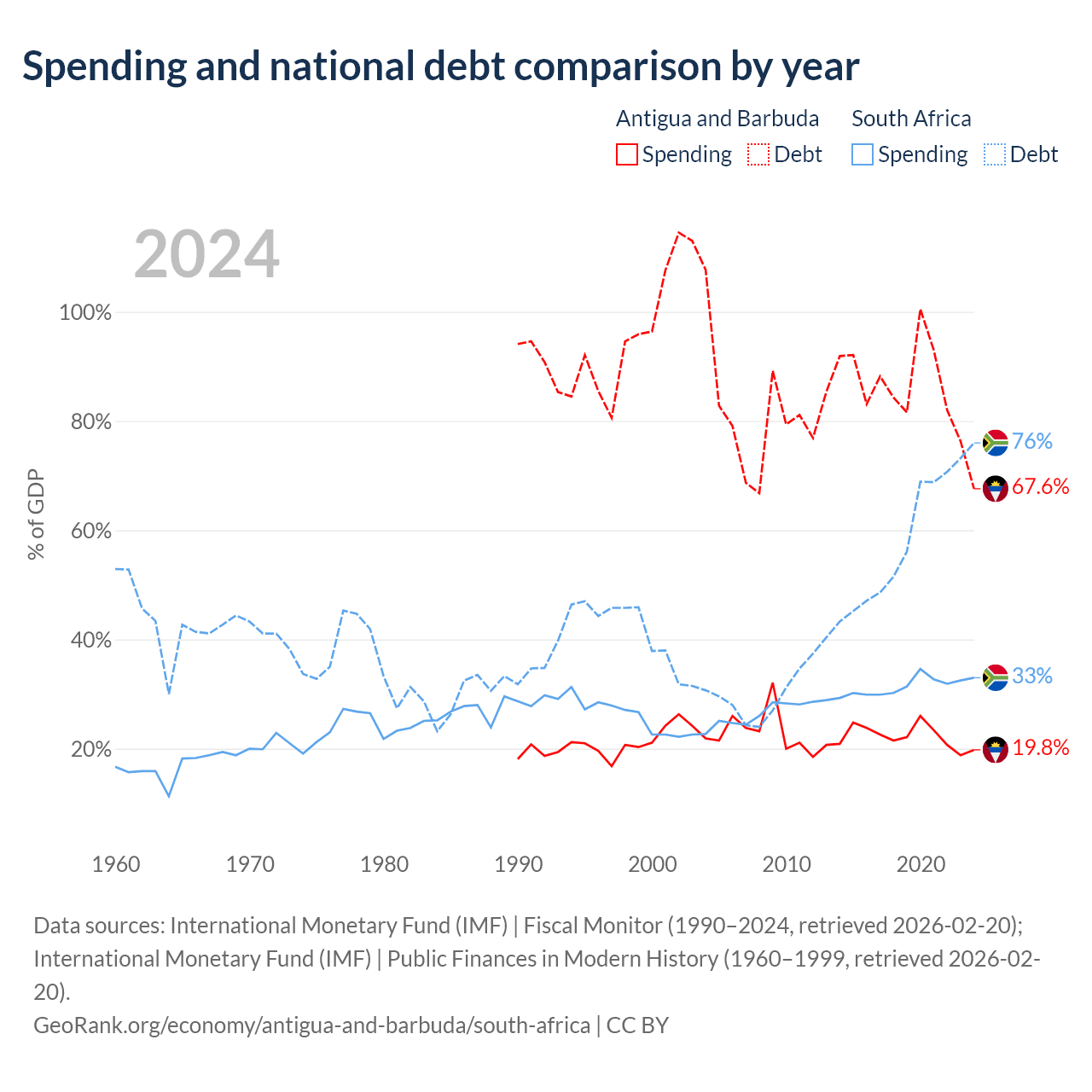 Antigua and Barbuda has $1.49B in government debt (67.6% of GDP), compared to $305B (76% of GDP) in South Africa.