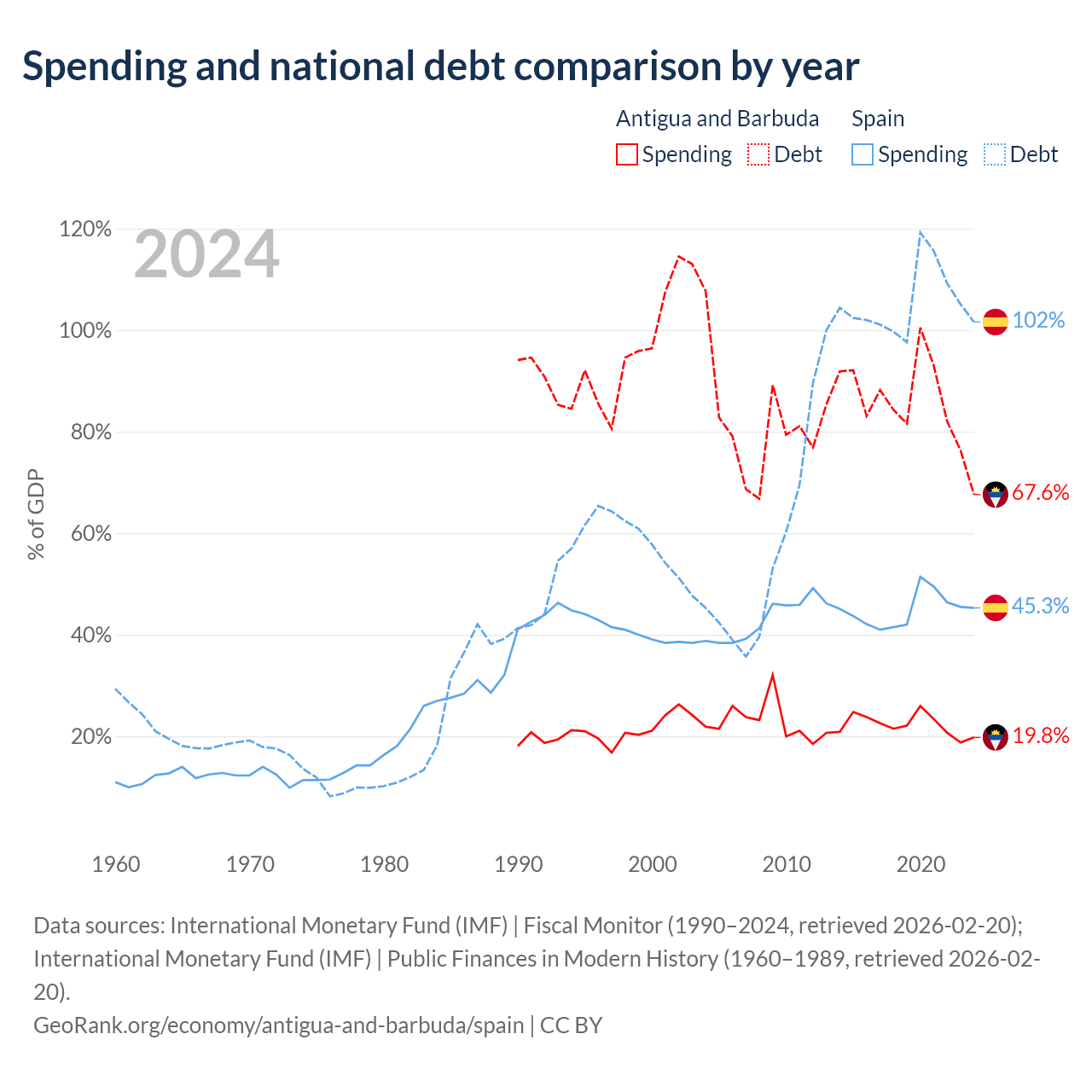 Antigua and Barbuda has $1.49B in government debt (67.6% of GDP), compared to $1.75T (101.6% of GDP) in Spain.