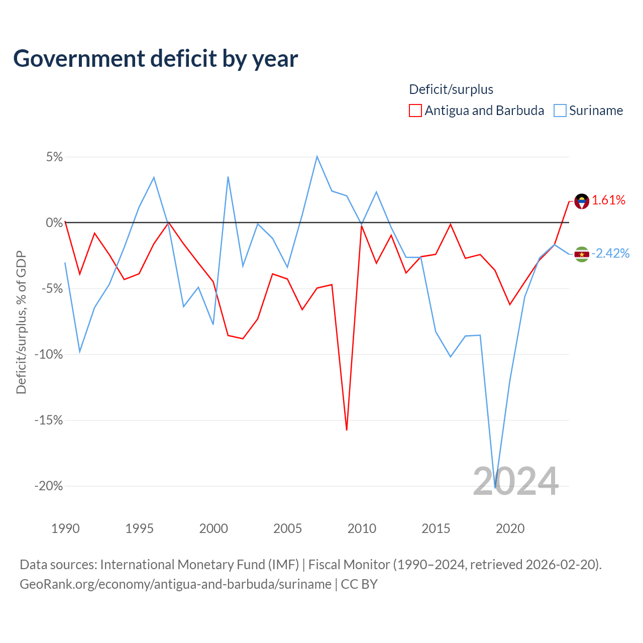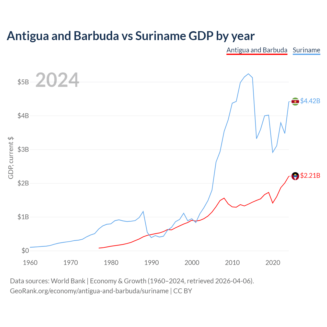 Antigua and Barbuda has a GDP of $2.21B compared to $4.42B for Suriname, ranking 177/197 and 164/197 by economy size, respectively.