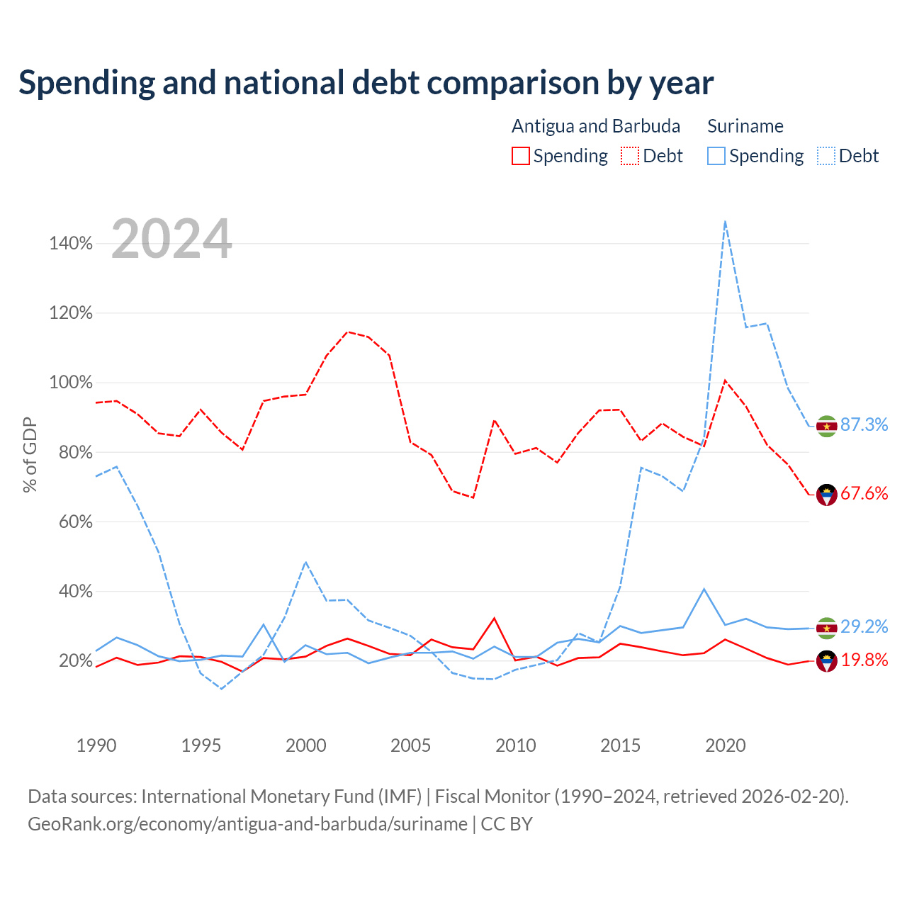 Antigua and Barbuda has $1.49B in government debt (67.6% of GDP), compared to $3.86B (87.3% of GDP) in Suriname.