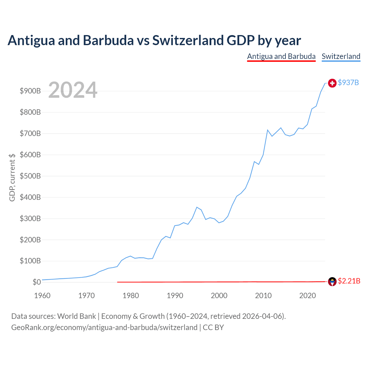 Antigua and Barbuda has a GDP of $2.21B compared to $937B for Switzerland, ranking 177/197 and 20/197 by economy size, respectively.