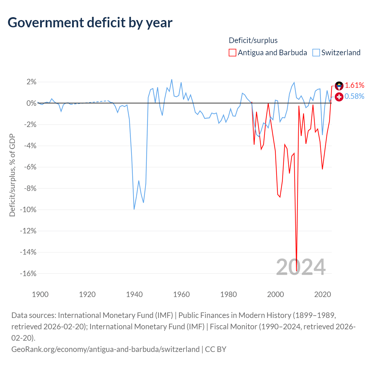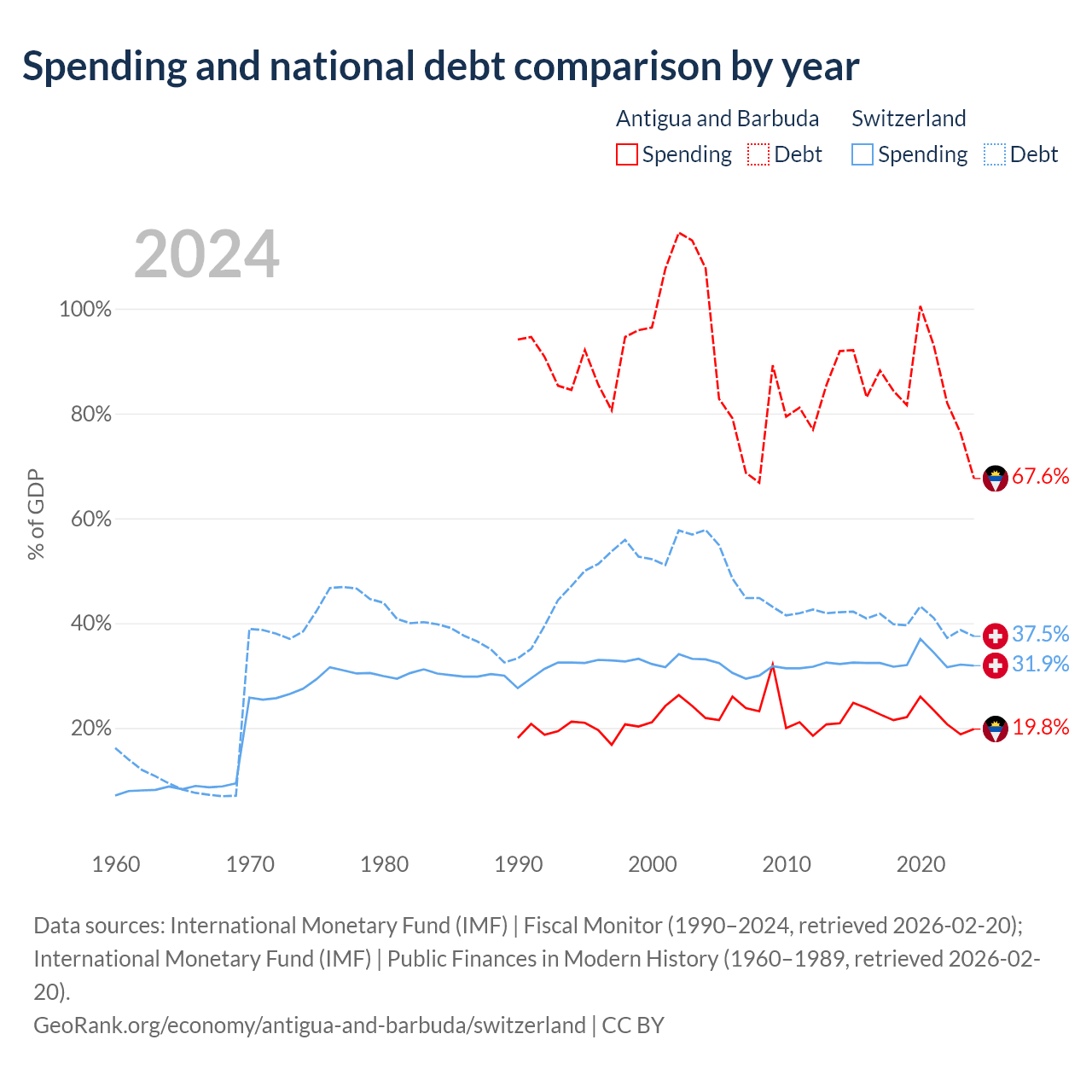 Antigua and Barbuda has $1.49B in government debt (67.6% of GDP), compared to $351B (37.5% of GDP) in Switzerland.