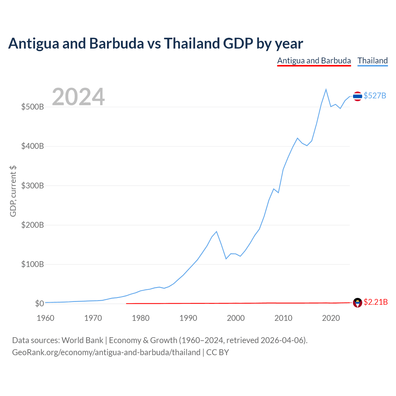 Antigua and Barbuda has a GDP of $2.21B compared to $527B for Thailand, ranking 177/197 and 31/197 by economy size, respectively.