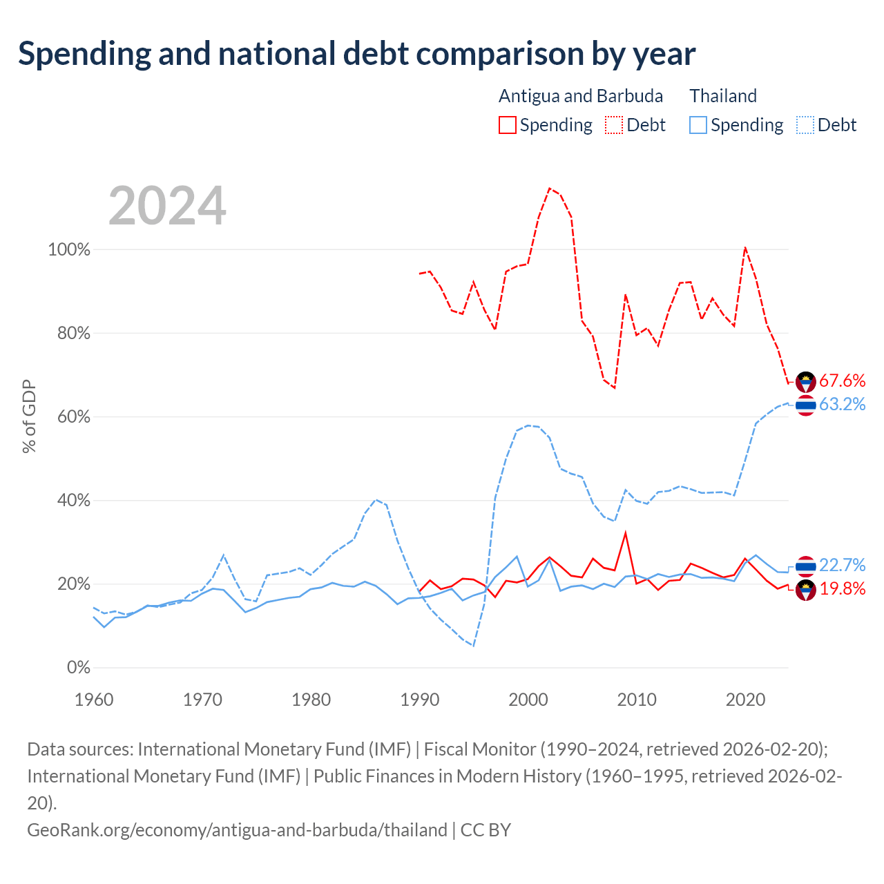 Antigua and Barbuda has $1.49B in government debt (67.6% of GDP), compared to $333B (63.2% of GDP) in Thailand.