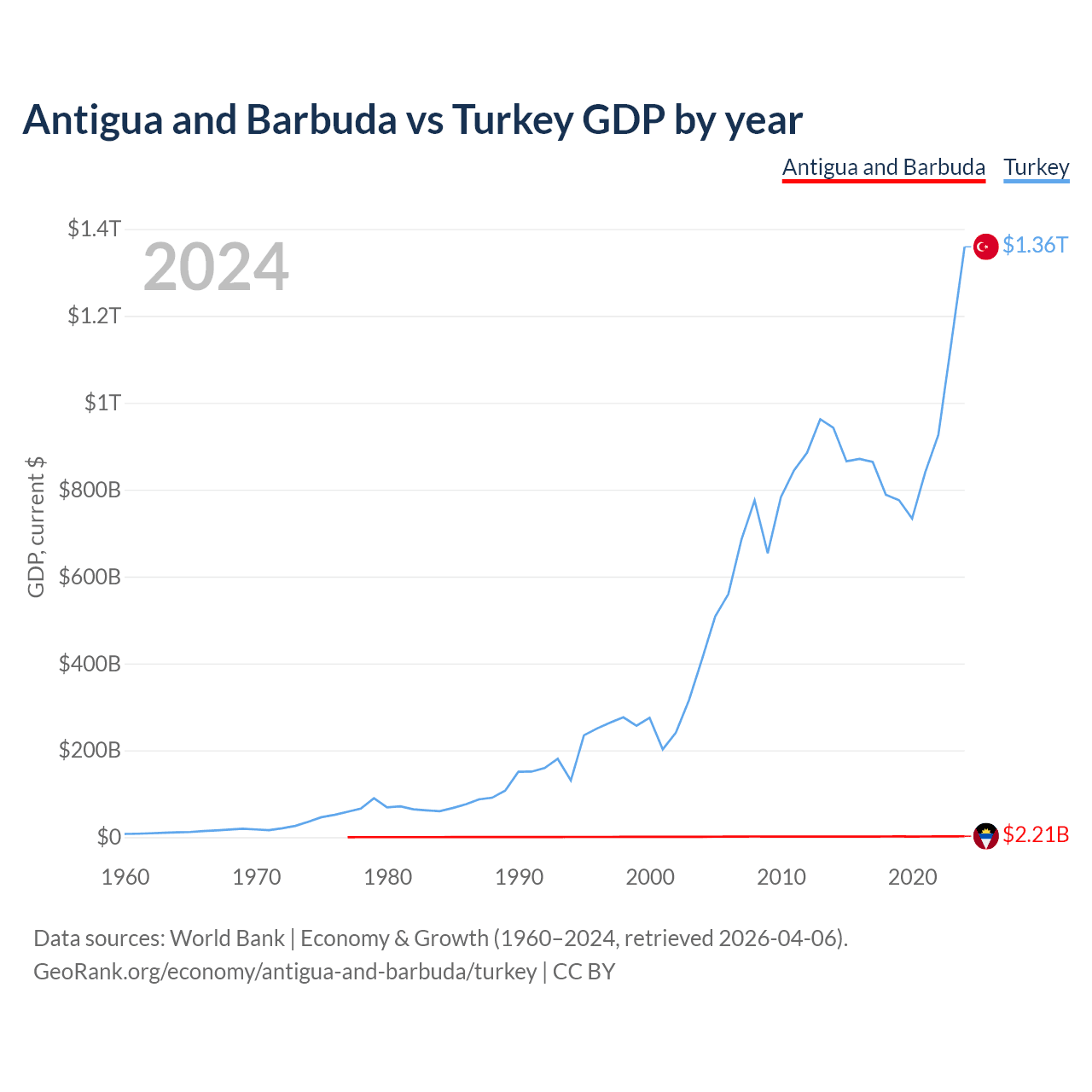 Antigua and Barbuda has a GDP of $2.21B compared to $1.36T for Turkey, ranking 177/197 and 17/197 by economy size, respectively.