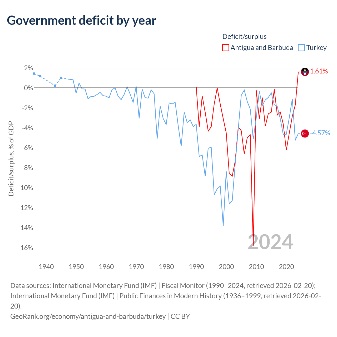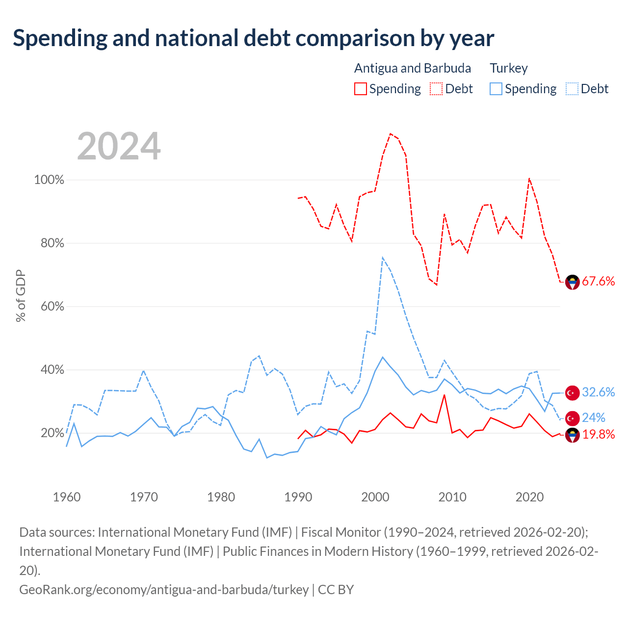 Antigua and Barbuda has $1.49B in government debt (67.6% of GDP), compared to $327B (24% of GDP) in Turkey.