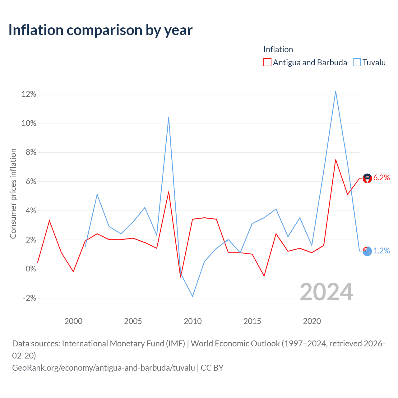 Over the past 24 years, Antigua and Barbuda has recorded an average annual inflation rate of 2.41%, compared with 3.34% in Tuvalu. In 2024, inflation was 6.2% in Antigua and Barbuda and 1.2% in Tuvalu.