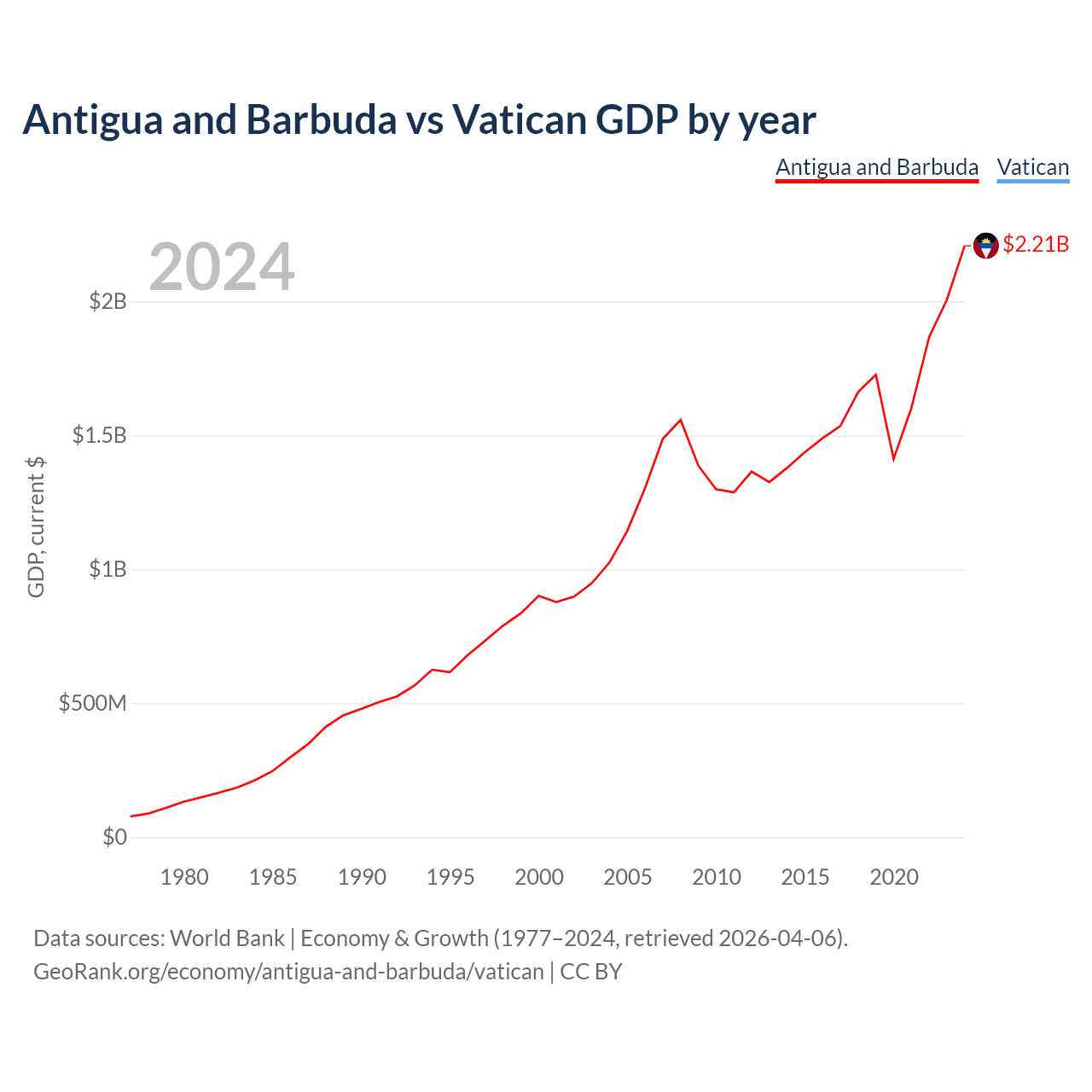 Antigua and Barbuda has a GDP of $2.21B compared to $19.8M for the Vatican, ranking 177/197 and 197/197 by economy size, respectively.