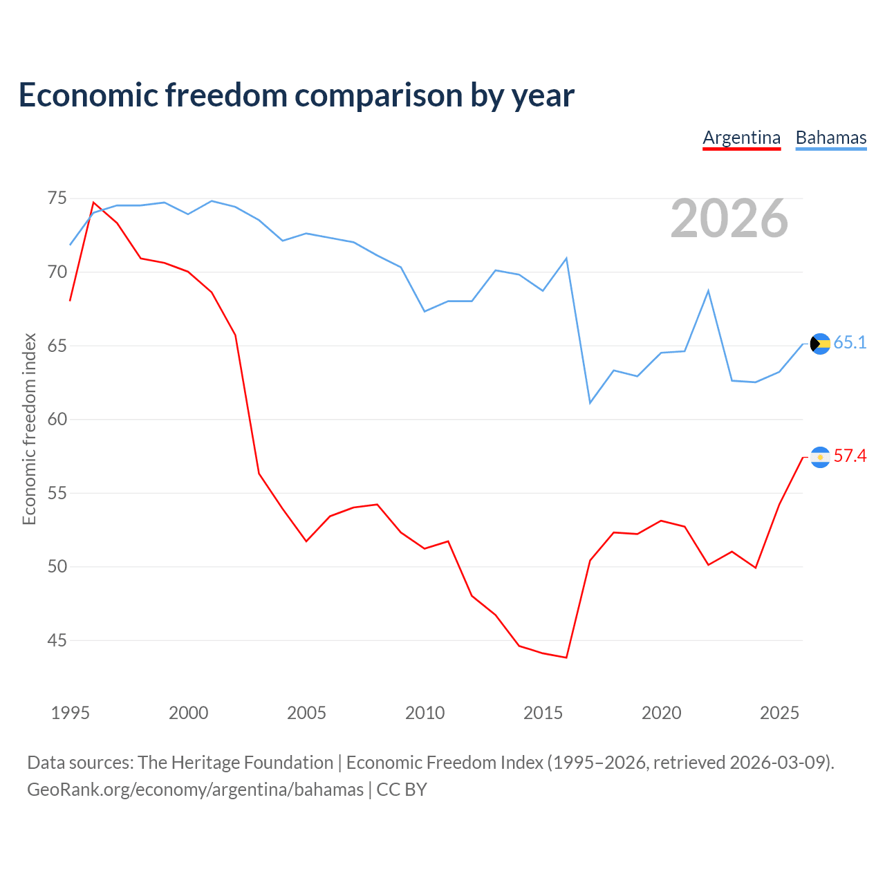 The Economic Freedom Index for Argentina is 57.4, ranking 117/197, compared to 65.1 for the Bahamas, ranking 66/197. The chart above displays a comparison of annual changes in economic freedom indexes.