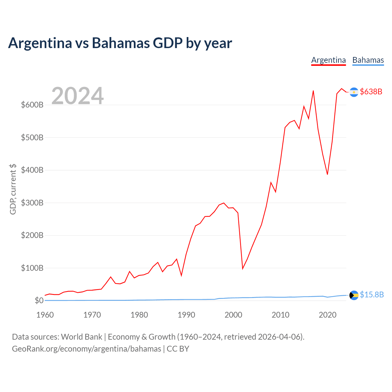 Argentina has a GDP of $638B compared to $15.8B for the Bahamas, ranking 24/197 and 140/197 by economy size, respectively.
