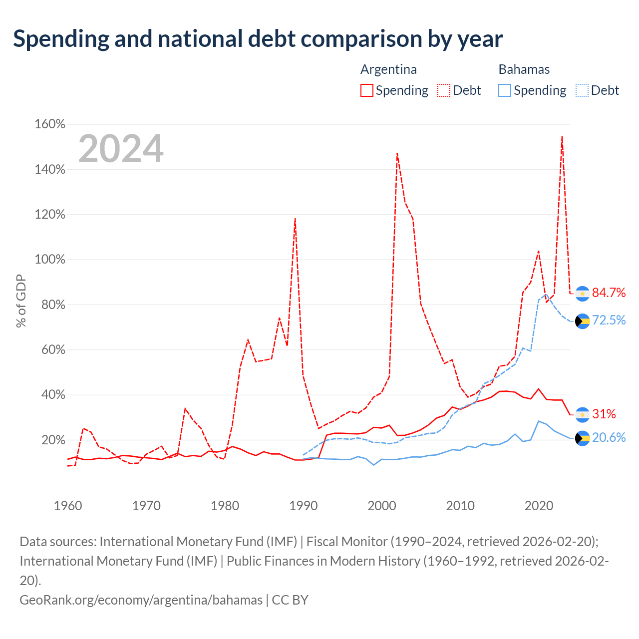 Argentina has $540B in government debt (84.7% of GDP), compared to $11.5B (72.5% of GDP) in the Bahamas.