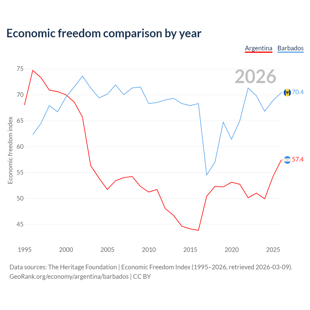 The Economic Freedom Index for Argentina is 57.4, ranking 117/197, compared to 70.4 for Barbados, ranking 34/197. The chart above displays a comparison of annual changes in economic freedom indexes.