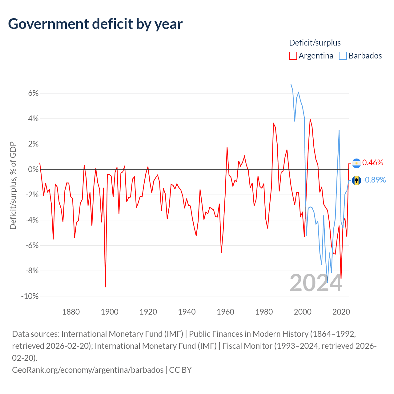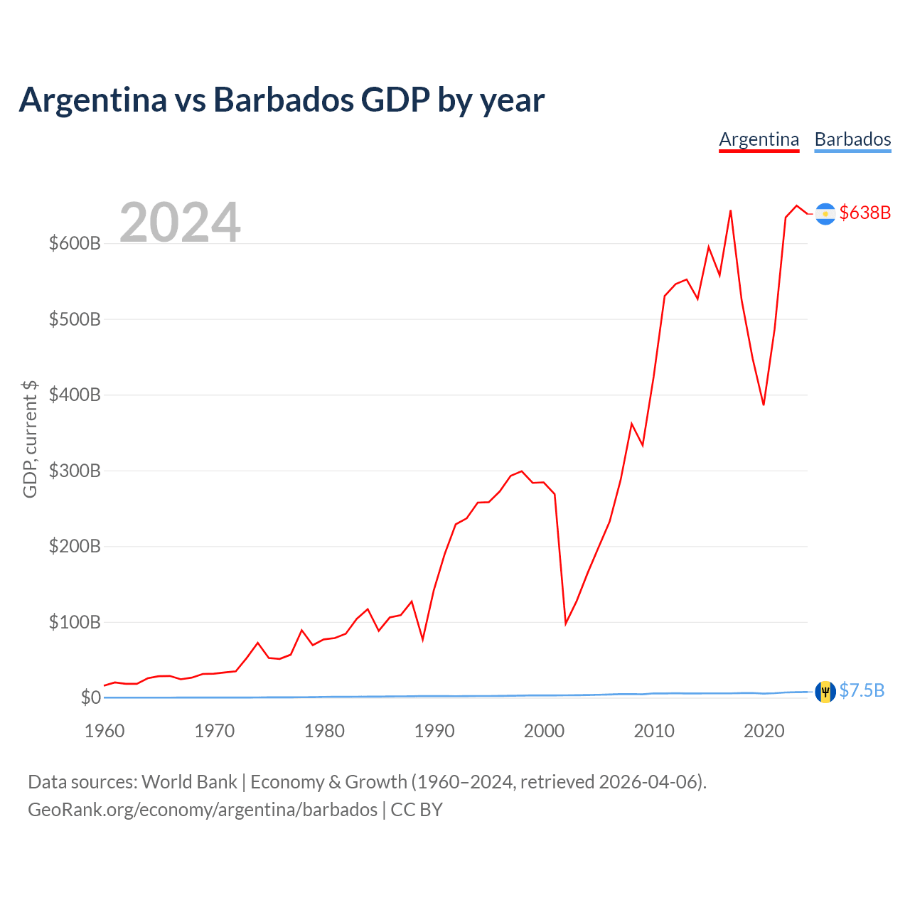 Argentina has a GDP of $638B compared to $7.5B for Barbados, ranking 24/197 and 157/197 by economy size, respectively.