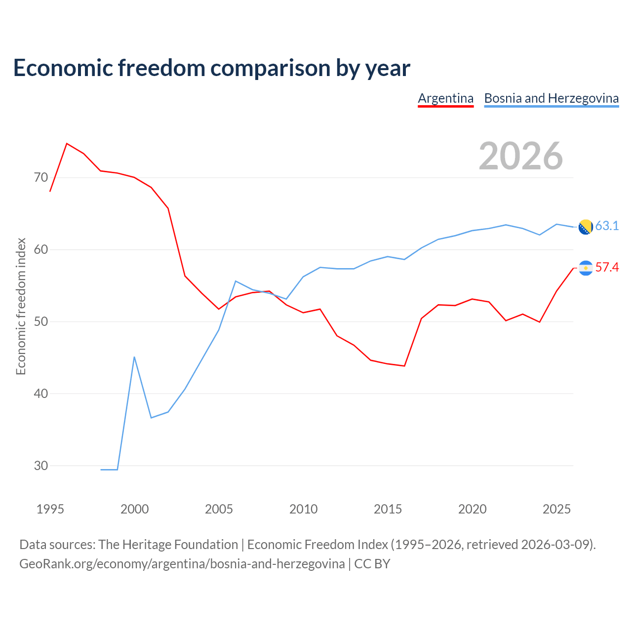 The Economic Freedom Index for Argentina is 57.4, ranking 117/197, compared to 63.1 for Bosnia and Herzegovina, ranking 83/197. The chart above displays a comparison of annual changes in economic freedom indexes.
