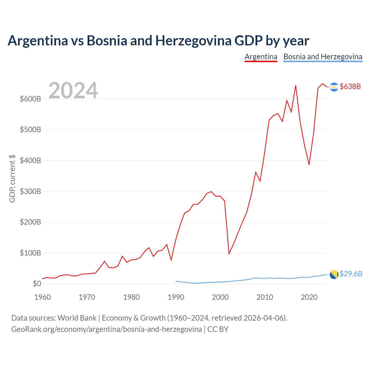 Argentina has a GDP of $638B compared to $29.6B for Bosnia and Herzegovina, ranking 24/197 and 111/197 by economy size, respectively.