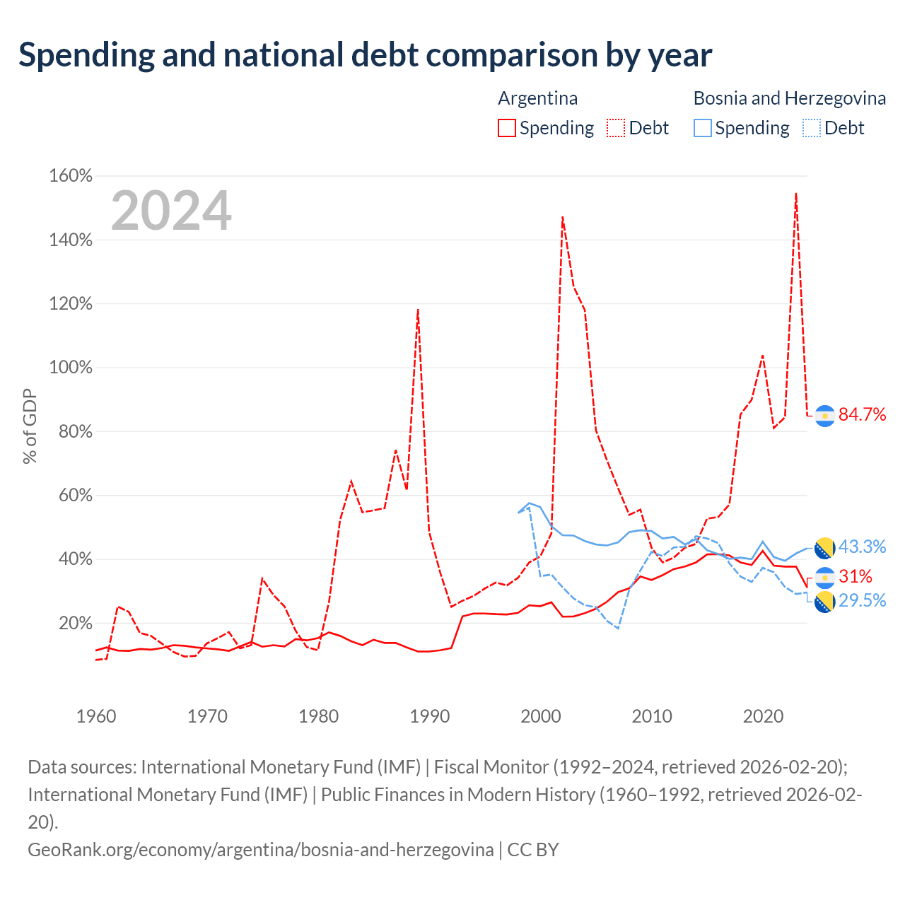 Argentina has $540B in government debt (84.7% of GDP), compared to $8.74B (29.5% of GDP) in Bosnia and Herzegovina.