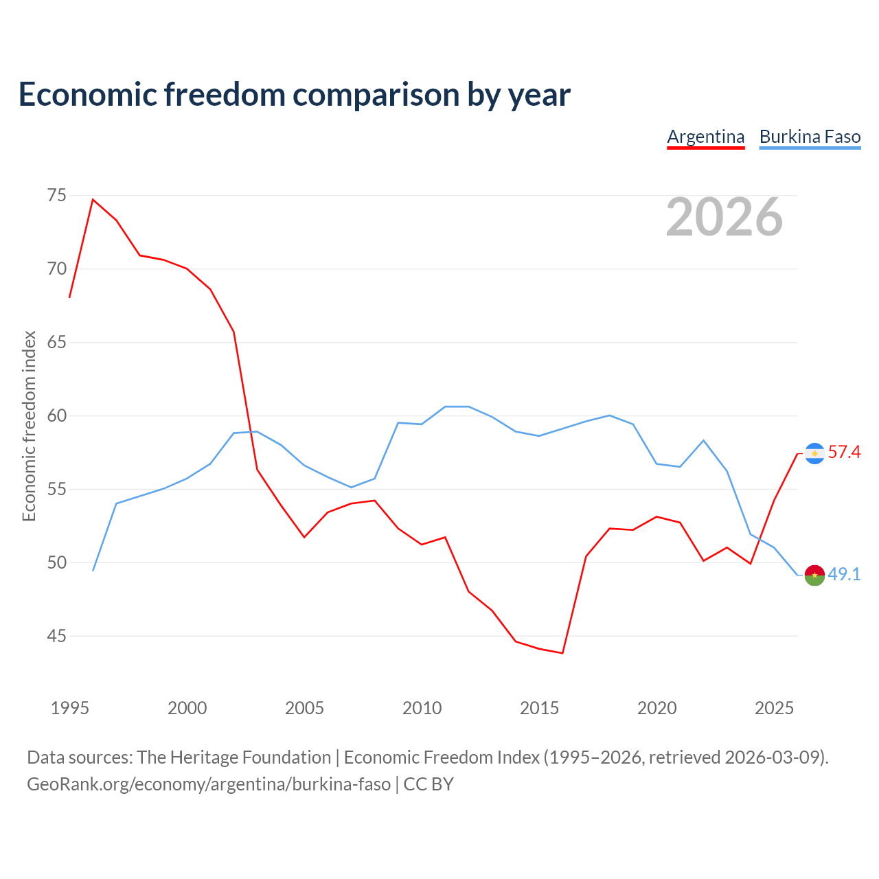 The Economic Freedom Index for Argentina is 57.4, ranking 117/197, compared to 49.1 for Burkina Faso, ranking 167/197. The chart above displays a comparison of annual changes in economic freedom indexes.