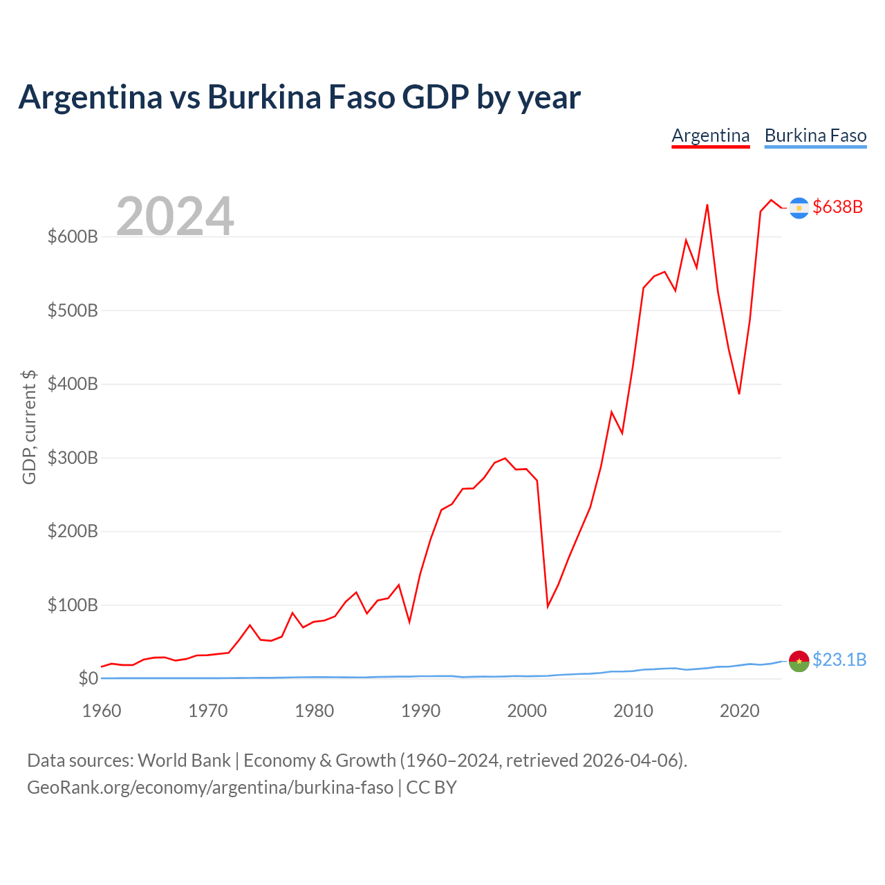 Argentina has a GDP of $638B compared to $23.1B for Burkina Faso, ranking 24/197 and 122/197 by economy size, respectively.