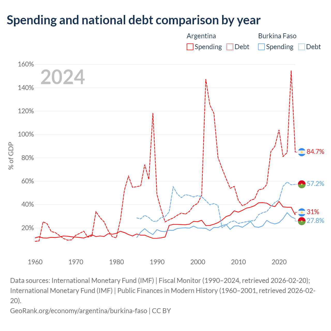 Argentina has $540B in government debt (84.7% of GDP), compared to $13.2B (57.2% of GDP) in Burkina Faso.
