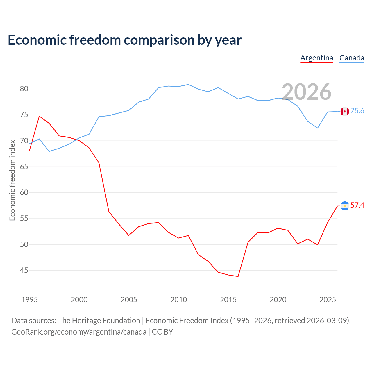 The Economic Freedom Index for Argentina is 57.4, ranking 117/197, compared to 75.6 for Canada, ranking 17/197. The chart above displays a comparison of annual changes in economic freedom indexes.