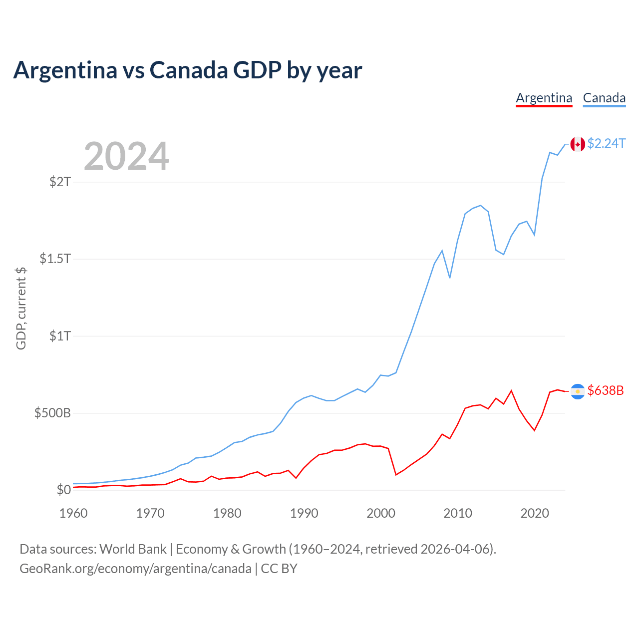 Argentina has a GDP of $638B compared to $2.24T for Canada, ranking 24/197 and 9/197 by economy size, respectively.