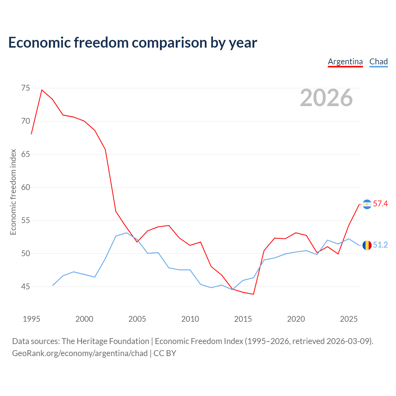 The Economic Freedom Index for Argentina is 57.4, ranking 117/197, compared to 51.2 for Chad, ranking 154/197. The chart above displays a comparison of annual changes in economic freedom indexes.