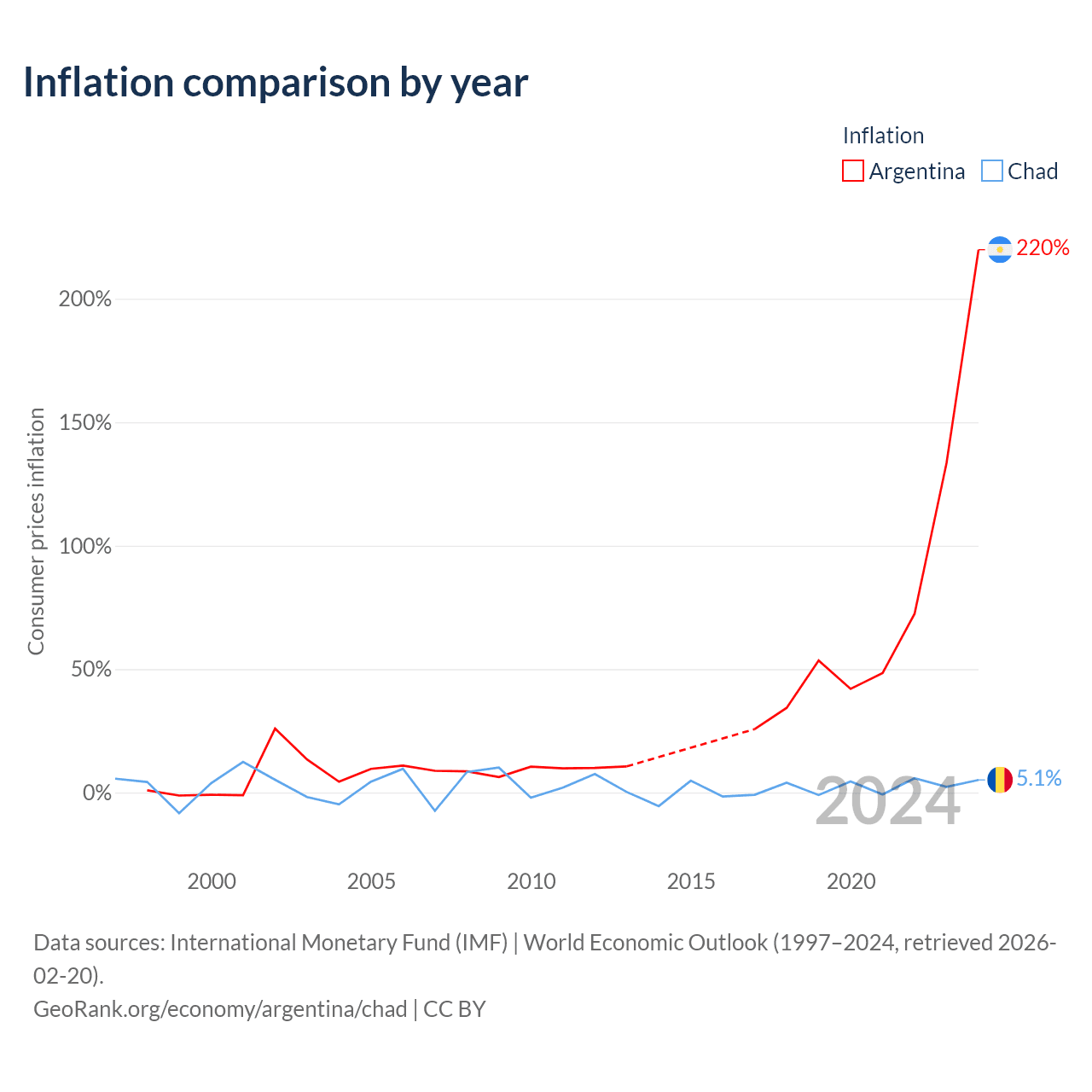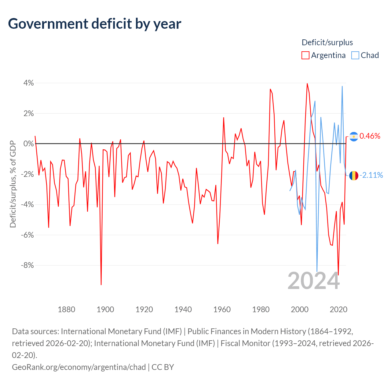 Argentina has a GDP of $638B compared to $19.5B for Chad, ranking 24/197 and 132/197 by economy size, respectively.