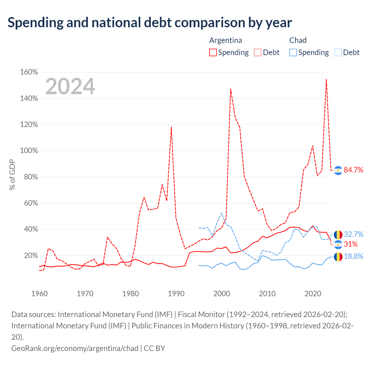 Argentina has $540B in government debt (84.7% of GDP), compared to $6.37B (32.7% of GDP) in Chad.