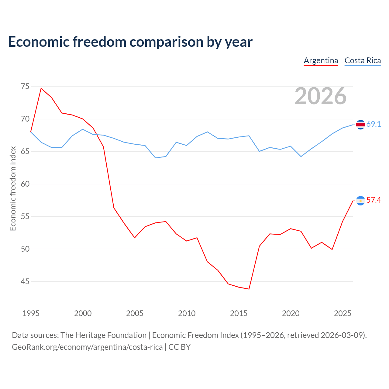 The Economic Freedom Index for Argentina is 57.4, ranking 117/197, compared to 69.1 for Costa Rica, ranking 43/197. The chart above displays a comparison of annual changes in economic freedom indexes.