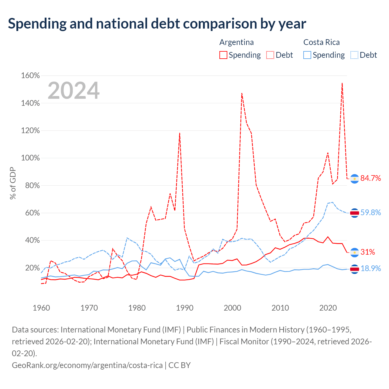 Argentina has $540B in government debt (84.7% of GDP), compared to $57B (59.8% of GDP) in Costa Rica.