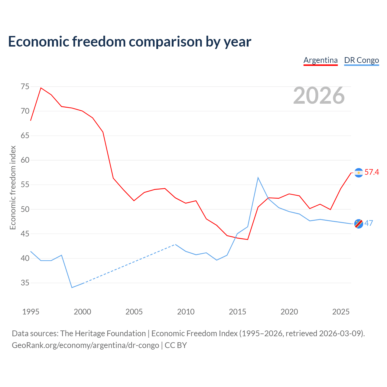 The Economic Freedom Index for Argentina is 57.4, ranking 117/197, compared to 47 for the DR Congo, ranking 176/197. The chart above displays a comparison of annual changes in economic freedom indexes.
