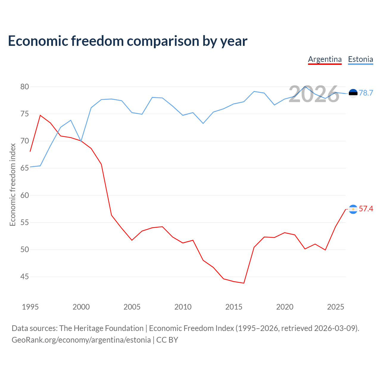 The Economic Freedom Index for Argentina is 57.4, ranking 117/197, compared to 78.7 for Estonia, ranking 10/197. The chart above displays a comparison of annual changes in economic freedom indexes.