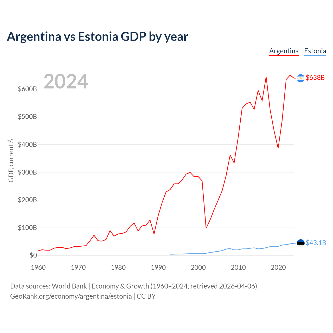 Argentina has a GDP of $638B compared to $43.1B for Estonia, ranking 24/197 and 100/197 by economy size, respectively.