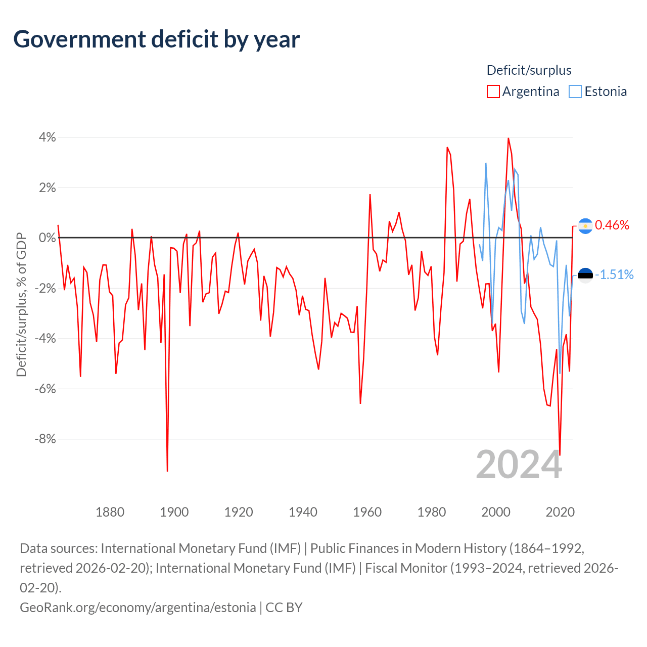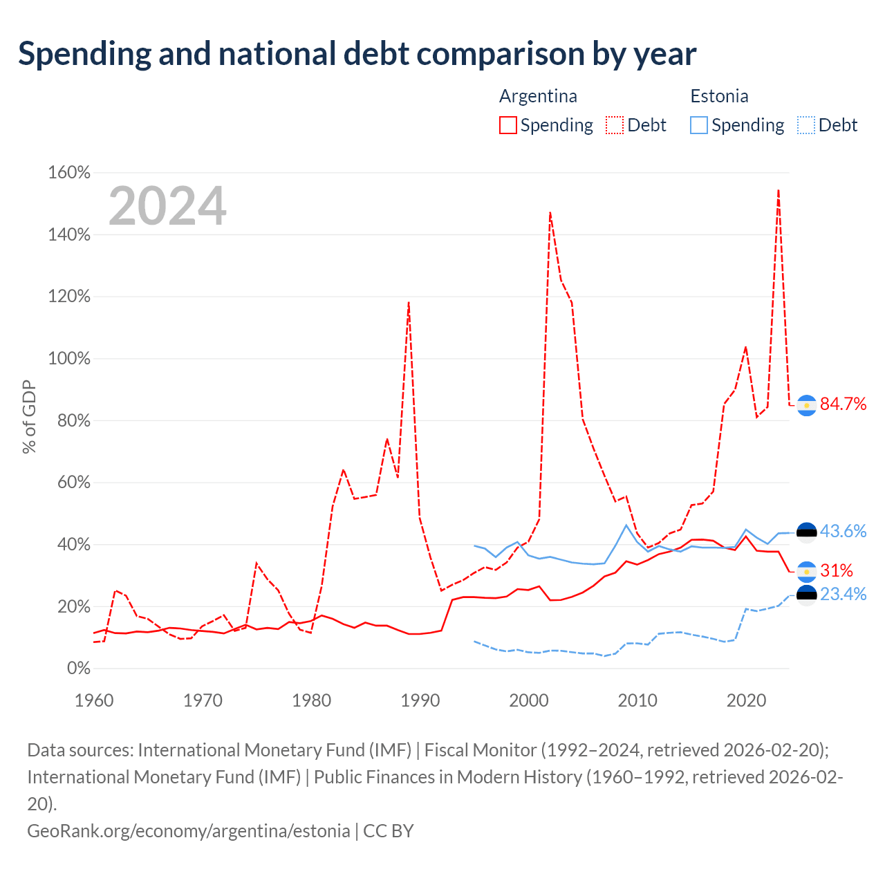 Argentina has $540B in government debt (84.7% of GDP), compared to $10.1B (23.4% of GDP) in Estonia.