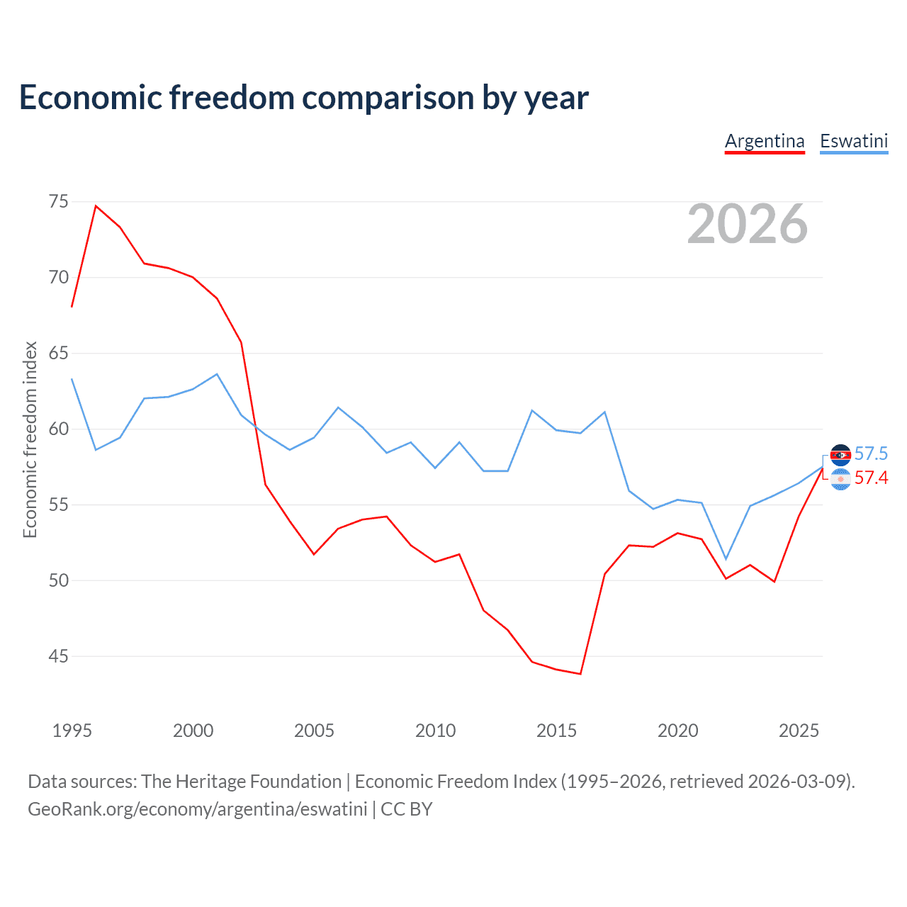 The Economic Freedom Index for Argentina is 57.4, ranking 117/197, compared to 57.5 for Eswatini, ranking 116/197. The chart above displays a comparison of annual changes in economic freedom indexes.