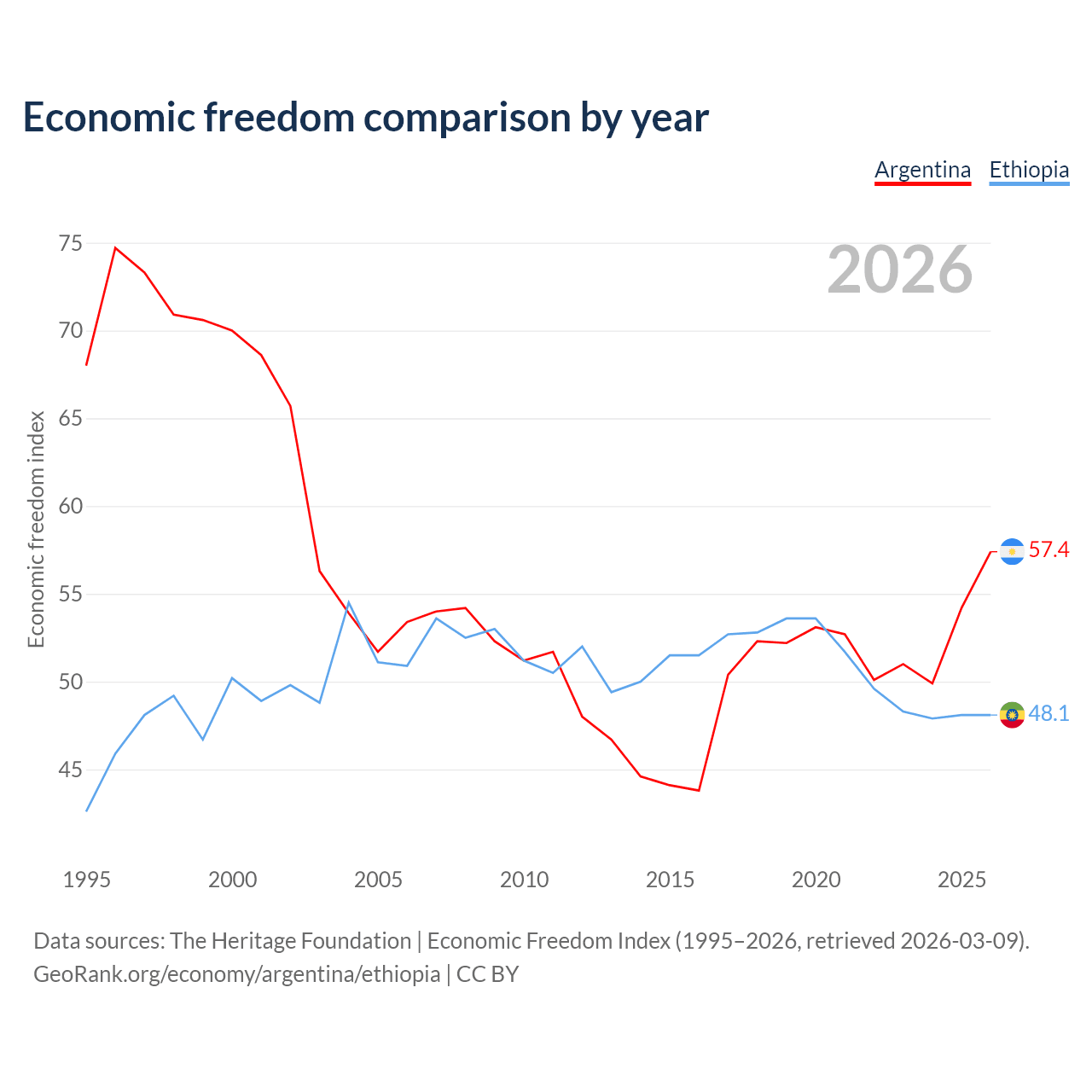 The Economic Freedom Index for Argentina is 57.4, ranking 117/197, compared to 48.1 for Ethiopia, ranking 171/197. The chart above displays a comparison of annual changes in economic freedom indexes.