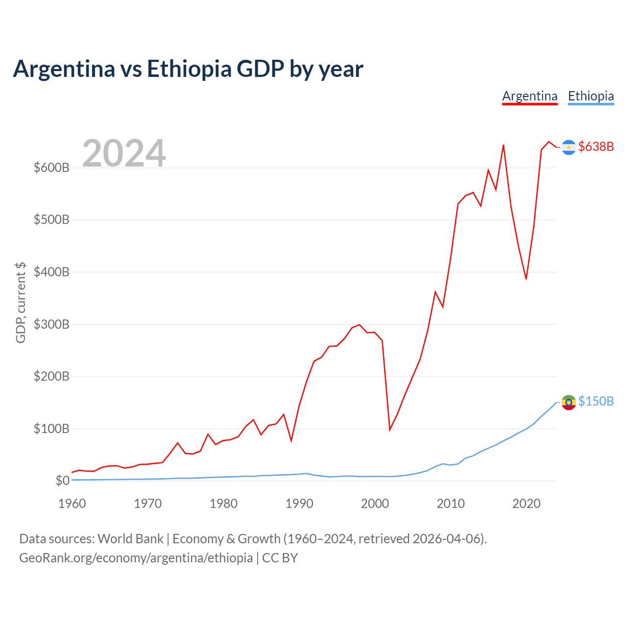 Argentina has a GDP of $638B compared to $150B for Ethiopia, ranking 24/197 and 60/197 by economy size, respectively.
