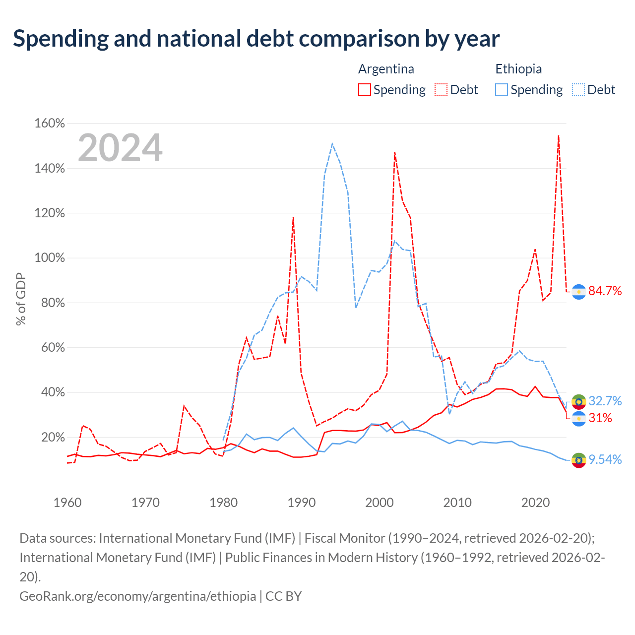 Argentina has $540B in government debt (84.7% of GDP), compared to $48.9B (32.7% of GDP) in Ethiopia.