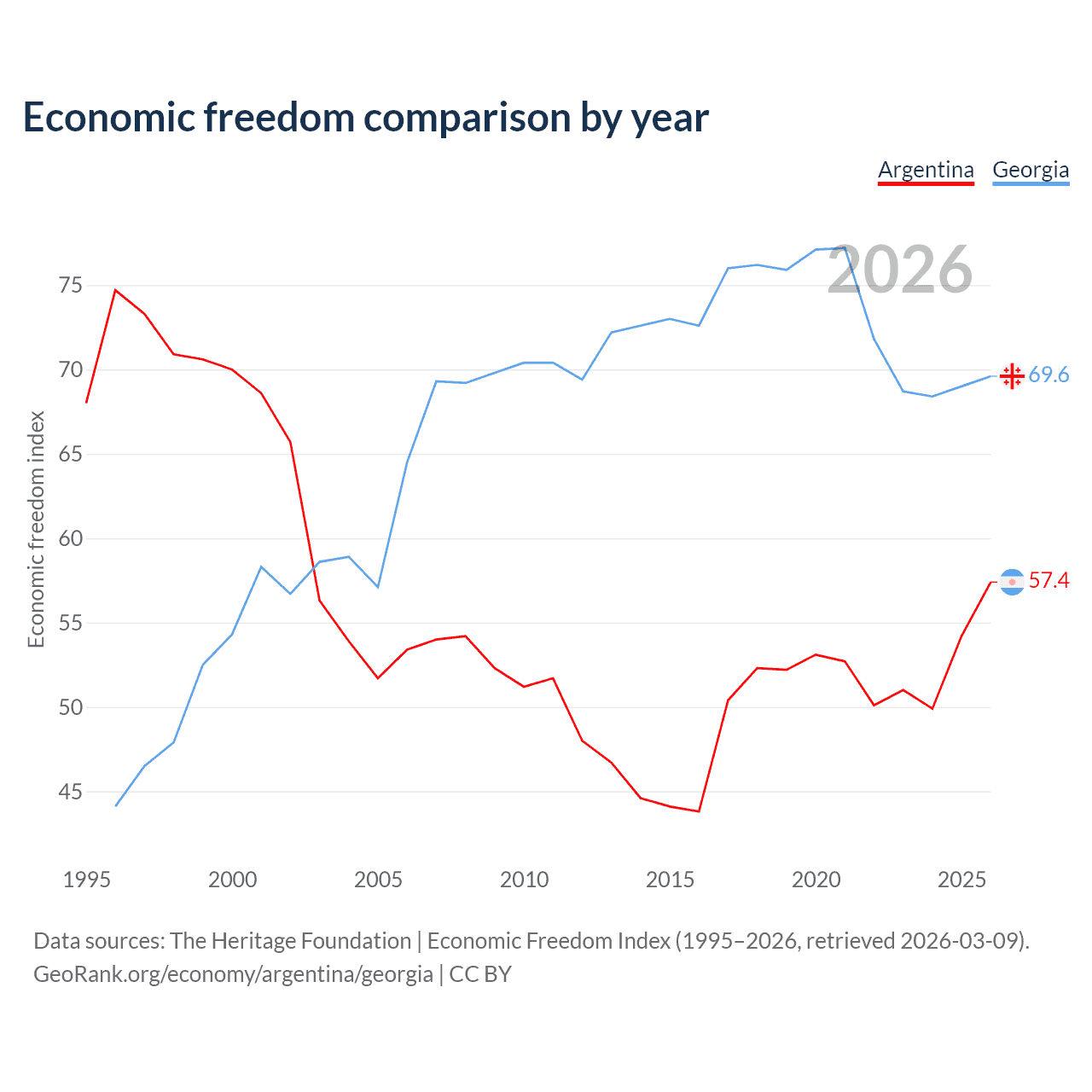The Economic Freedom Index for Argentina is 57.4, ranking 117/197, compared to 69.6 for Georgia, ranking 41/197. The chart above displays a comparison of annual changes in economic freedom indexes.
