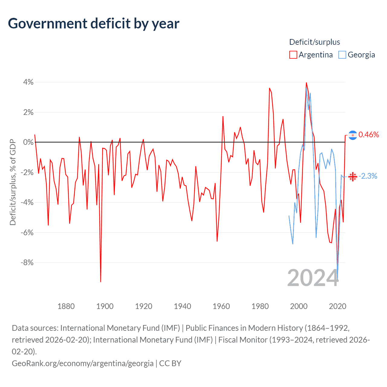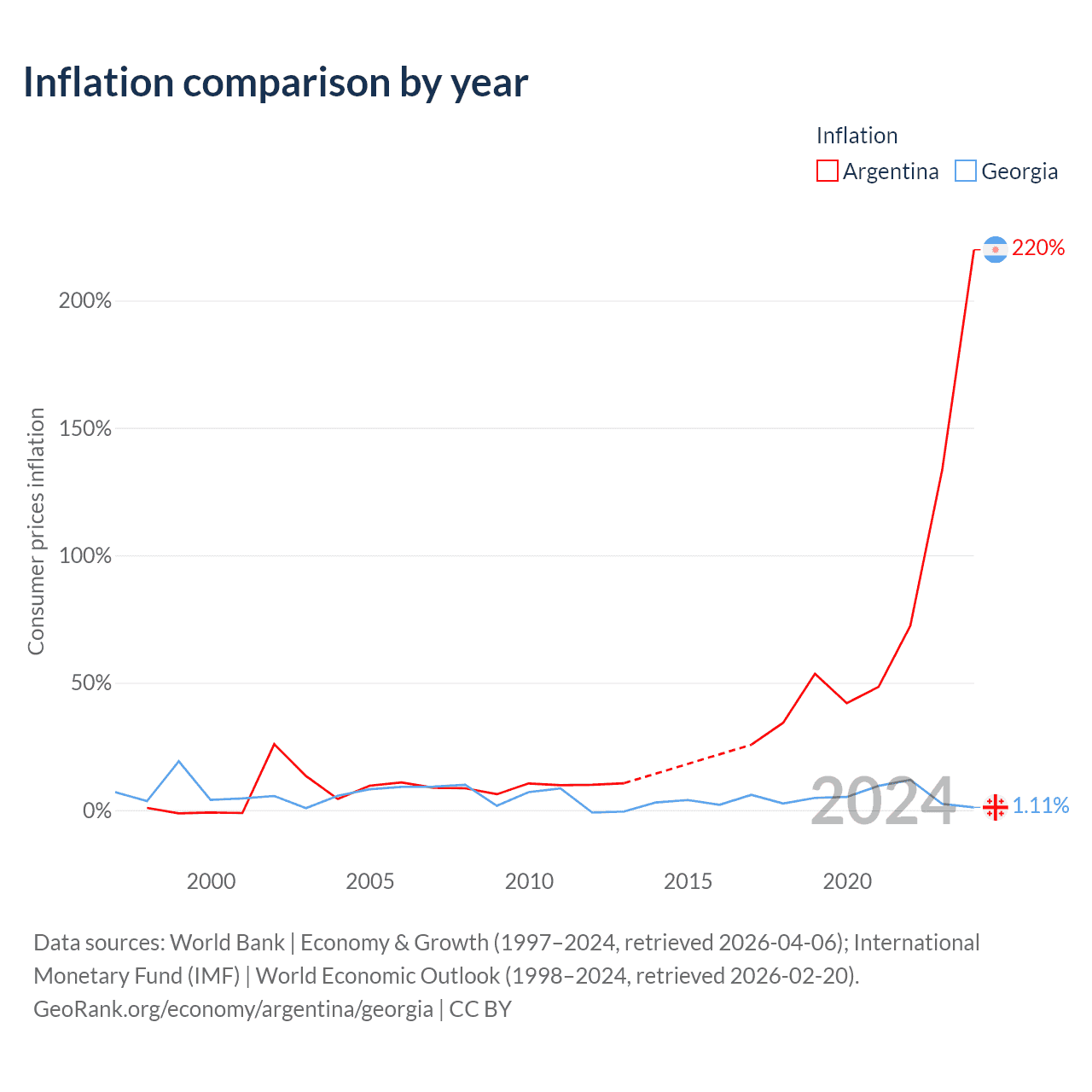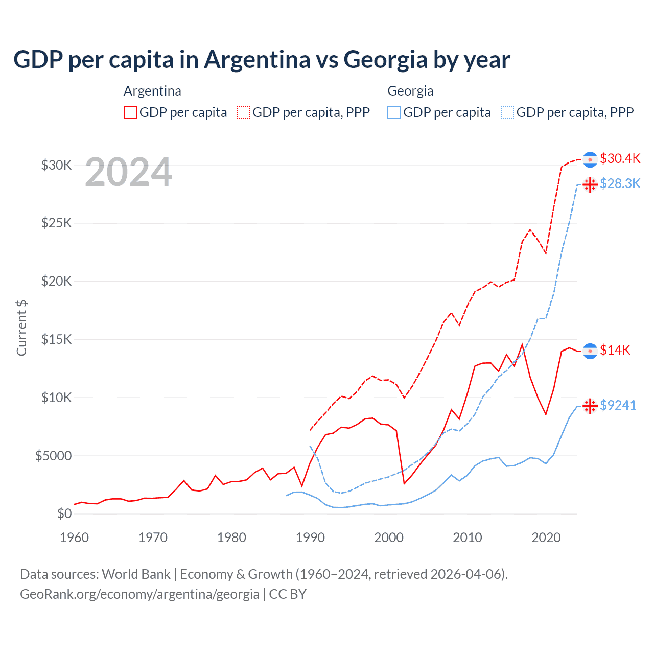 Argentina has a GDP of $638B compared to $34.2B for Georgia, ranking 24/197 and 107/197 by economy size, respectively.