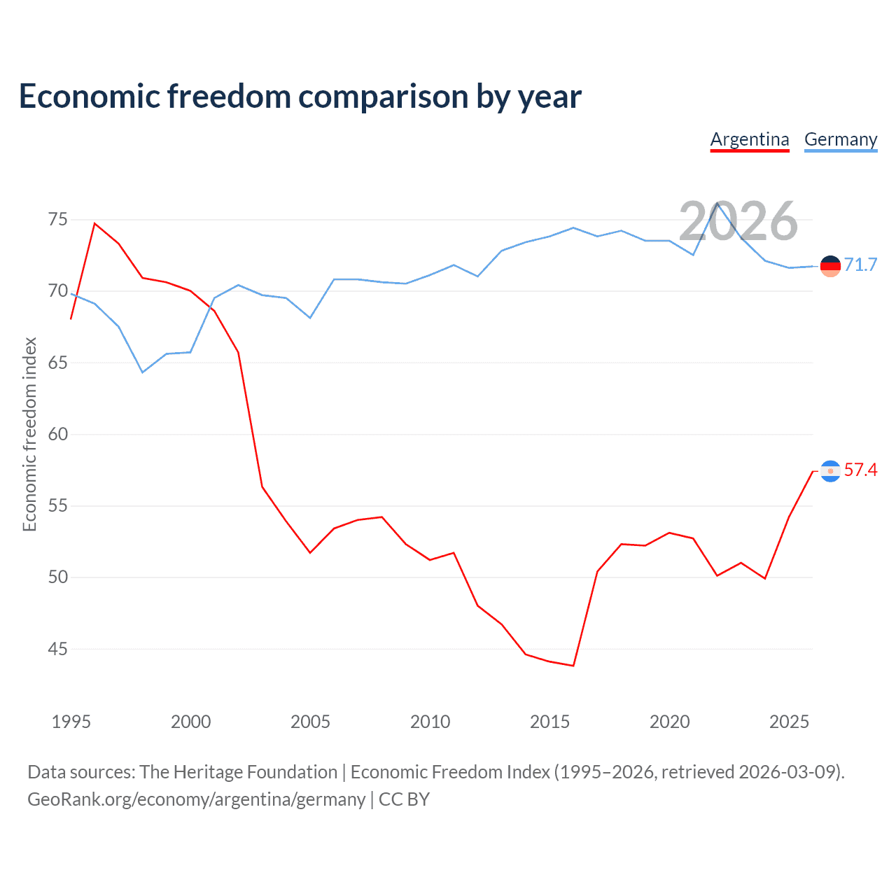 The Economic Freedom Index for Argentina is 57.4, ranking 117/197, compared to 71.7 for Germany, ranking 30/197. The chart above displays a comparison of annual changes in economic freedom indexes.