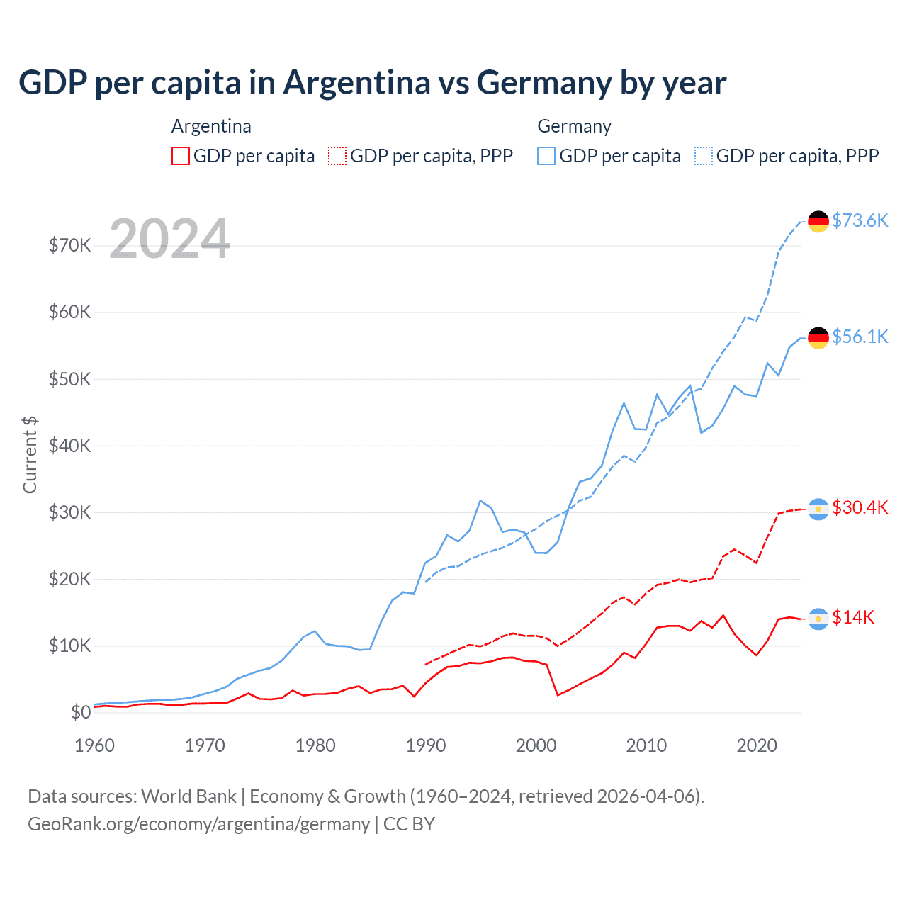 Argentina has a GDP of $638B compared to $4.69T for Germany, ranking 24/197 and 3/197 by economy size, respectively.