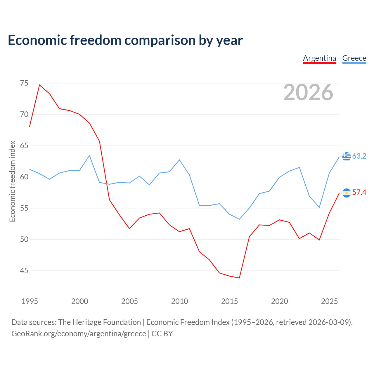 The Economic Freedom Index for Argentina is 57.4, ranking 117/197, compared to 63.2 for Greece, ranking 82/197. The chart above displays a comparison of annual changes in economic freedom indexes.